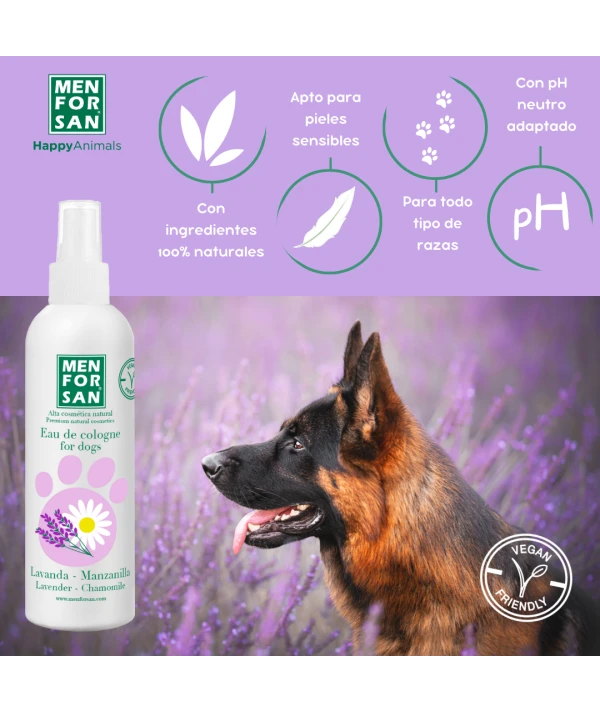 Eau deodorant për qen me aromë LAVANDER & KAMOMILi krijuar posaçërisht për të ofruar një erë të freskët pas larjes dhe një efekt deodorant intensiv që është shumë i këndshëm duke respektuar lëkurën dhe vetitë nuhatëse të kafshës.