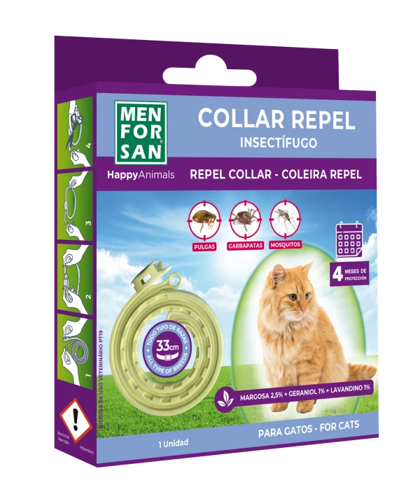 Qafore kundër insekteve për macet. Përmban 3 aktive repelente natyrale (ekstrakti Margose (neem), Geraniol dhe vaj Lavandin) që mbrojnë nga infektimet e parazitëve të jashtëm: pleshtat, rriqrat, morrat, marimangat dhe gjithashtu nga pickimi i mushkonjave.
