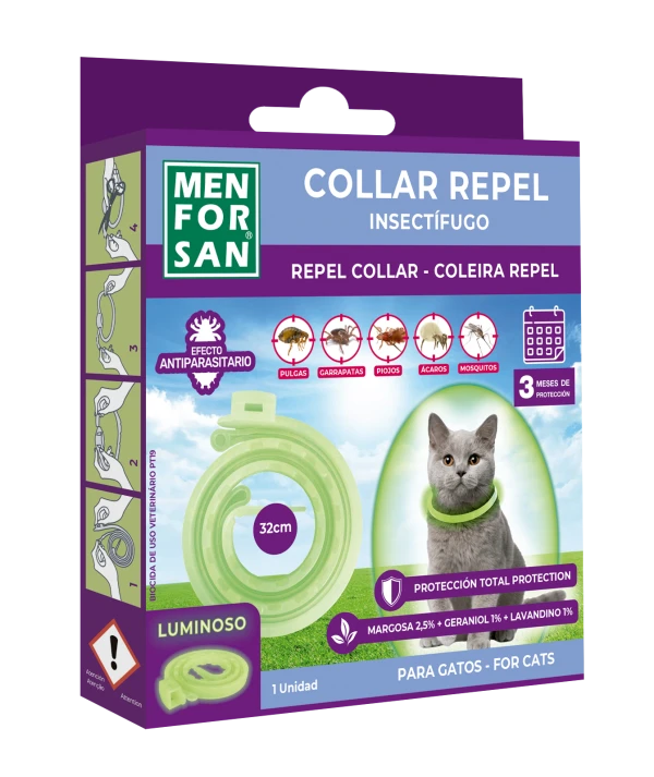 Rrip kundër insekteve për macet. Përmban 3 aktive repelente natyrale (ekstrakti Margose (neem), Geraniol dhe vaj Lavandin) që mbrojnë nga infektimet e parazitëve të jashtëm: pleshtat, rriqrat, morrat, marimangat dhe gjithashtu nga pickimi i mushkonjave.