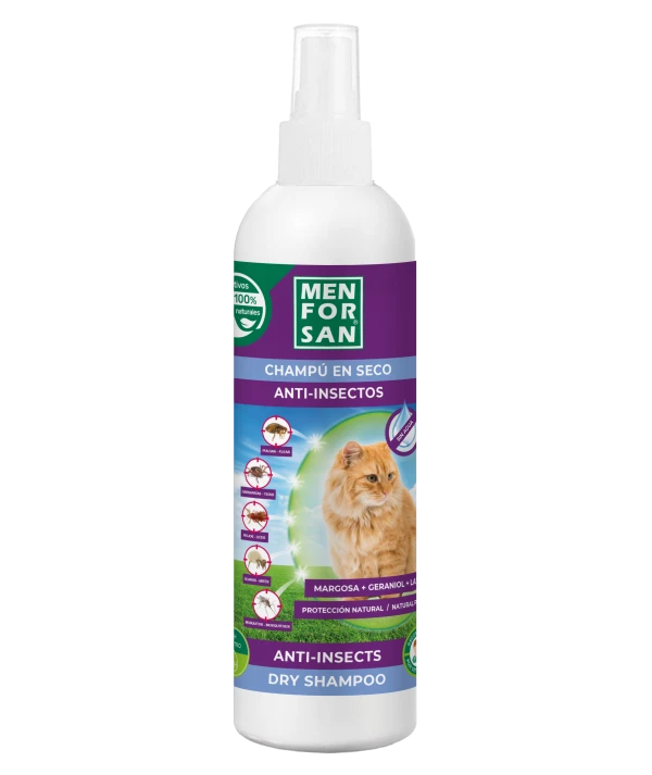 Shampo e thatë në format sprej natyral për mace me MARGOSA, GERANIOL dhe LAVANDIN.Ky produkt është i testuar shkencërisht dhe ka kaluar studime të efikasitetit që vërtetojnë se mbron kafshën tuaj nga sulmet e mushkonjave, pleshtave dhe rriqrave për 24 orë.