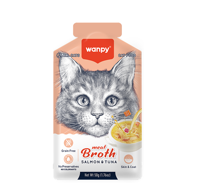 Lëngu i mishit Wanpy me salmon dhe ton është një ushqim hidratues për macet i bërë nga 100% salmon dhe ton i vërtetë, i gatuar ngadalë në 121°C për 30 minuta për të ruajtur shijen dhe vlerat ushqyese të pasura. Me 6.5% proteina me cilësi të lartë dhe 5 lëndë ushqyese thelbësore, është i lehtë për t’u përtypur, i butë në tretje dhe ideal për macet e të gjitha moshave, veçanërisht për të moshuarit. Shërbehet si përmirësues i vaktit ose më vete.