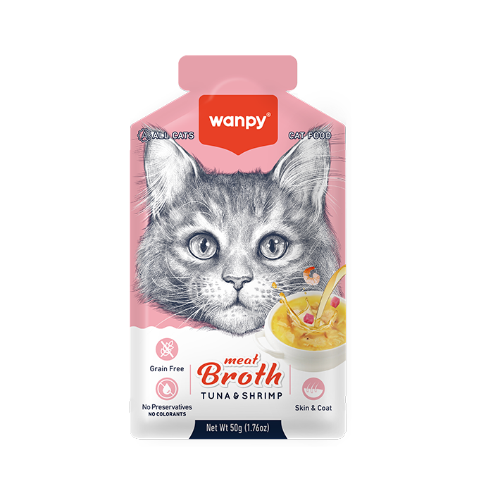 Lëngu i mishit Wanpy me ton dhe karkaleca deti është një ushqim hidratues për macet i bërë nga 100% ton dhe karkaleca deti të vërtetë, i gatuar ngadalë në 121°C për 30 minuta për të ruajtur shijen dhe vlerat ushqyese të pasura. Me 6.5% proteina me cilësi të lartë dhe 5 lëndë ushqyese thelbësore, është i lehtë për t’u përtypur, i butë në tretje dhe ideal për macet e të gjitha moshave, veçanërisht për të moshuarit. Shërbehet si përmirësues i vaktit ose më vete.